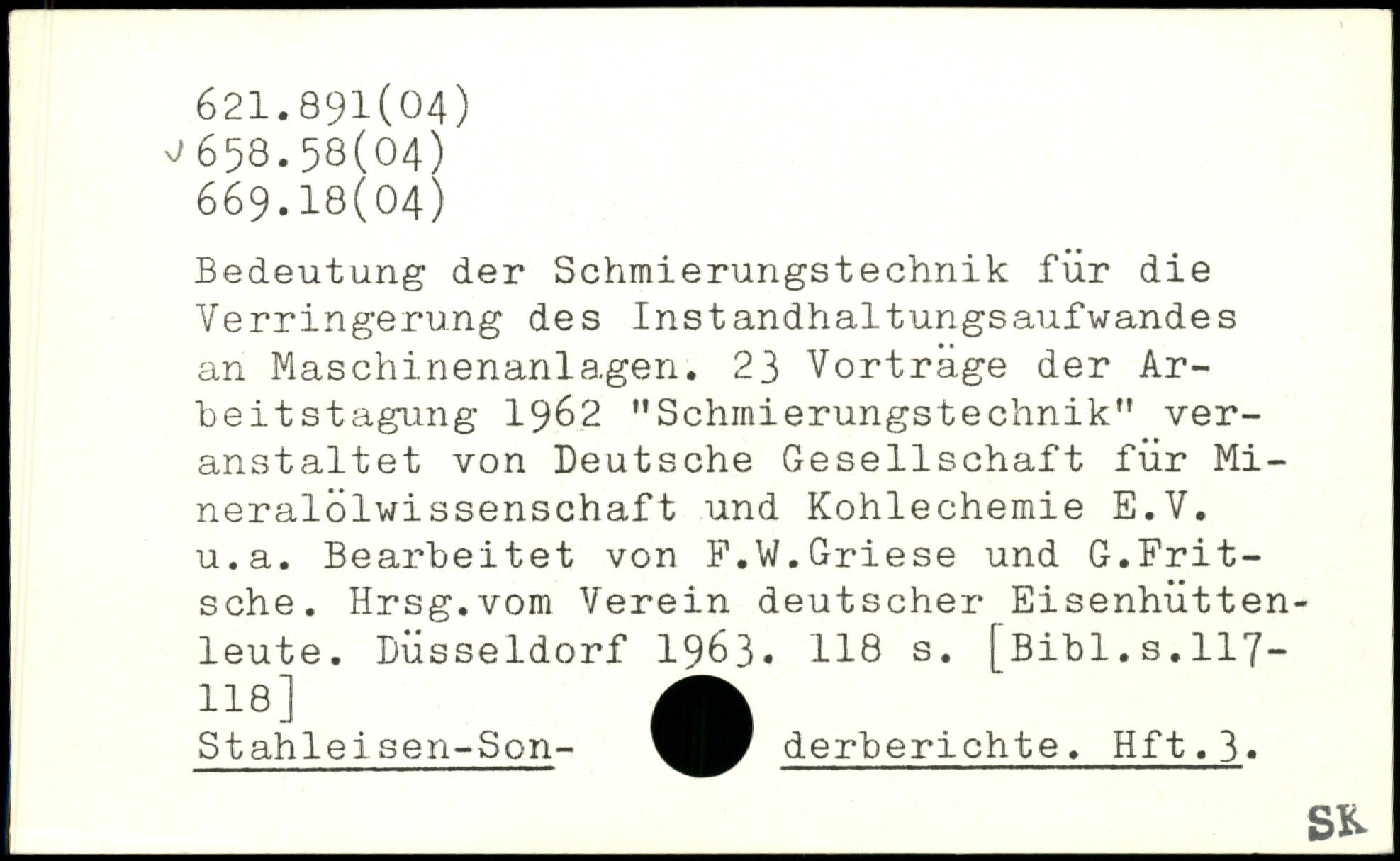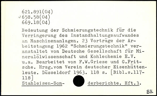 Bedeutung der Schmierungstechnik für die Verringerung des Instandhaltungsaufwandes an Maschinenanlagen. 23 Vorträge der Arbeitstagung 1962 "Schmierungstechnik" veranstaltet von Deutsche Gesellschaft für Mineralölwissenschaft und Kohlechemie E.V. u.a. Bearbeitet von F.W.Griese und G.Frit-sche. Hrsg.vom Verein deutscher Eisenhüttenleute. Düsseldorf 1963