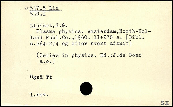 Plasma physics. Amsterdam,North-Hol-land Publ.Co.,1960.