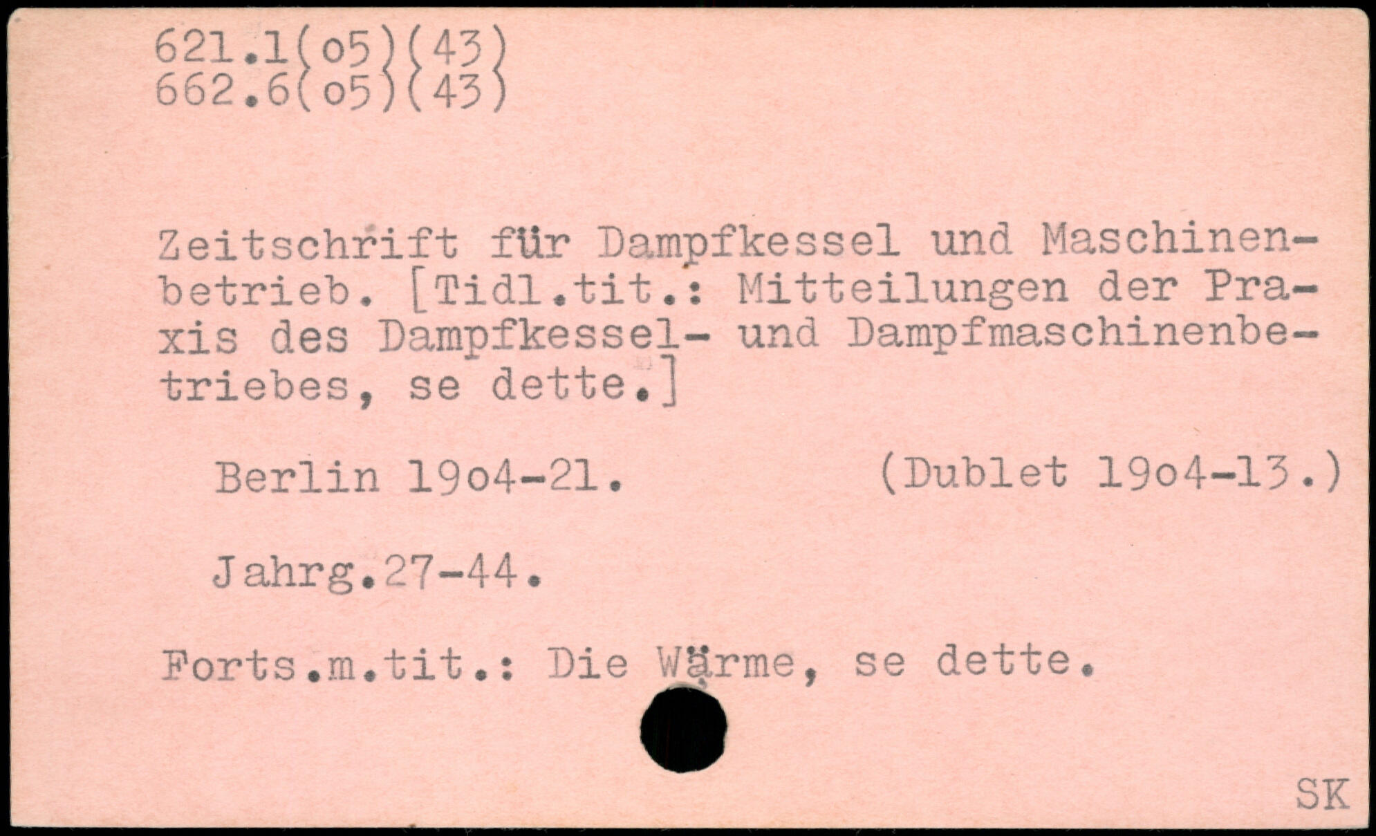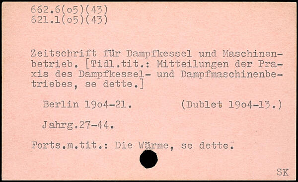 Zeitschrift für Dampfkessel und Maschinenbetrieb. [Tidl.tit.: Mitteilungen der Praxis des Dampfkessel- und Dampfmaschinenbetriebes, se dette.] Berlin 19o4-21. (Düblet 19o4-13.) Jahrg.27-44. Ports.m.tit.: Die Wärme, se dette. _.