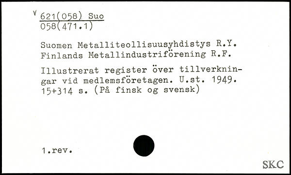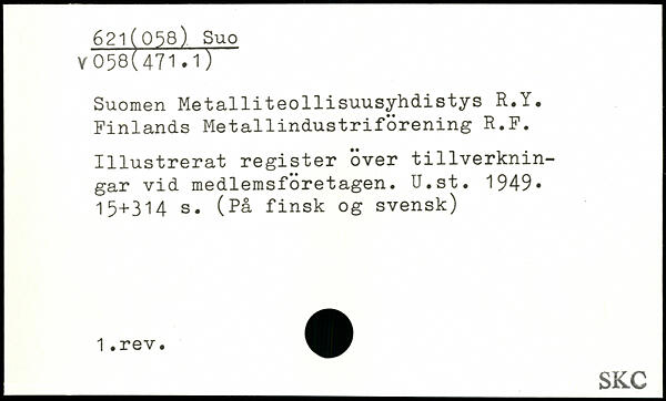 Suomen Metalliteollisuusyhdistys R.Y, Finlands Metallindustriförening R.F. Illustrerat register över tillverkningar vid medlemsföretagen. U.st. 1949