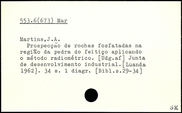 Prospecçao de rochas fosfatadas na regiao da pedra do feitiço aplicando o método radiométrico. [Udg.af] Junta de desenvolvimento industrial.[Luanda 1962].