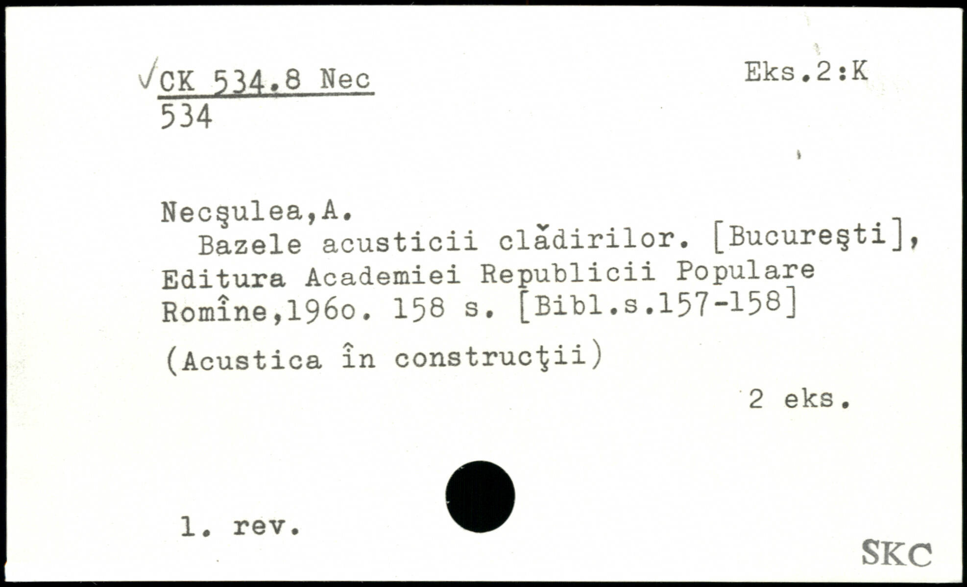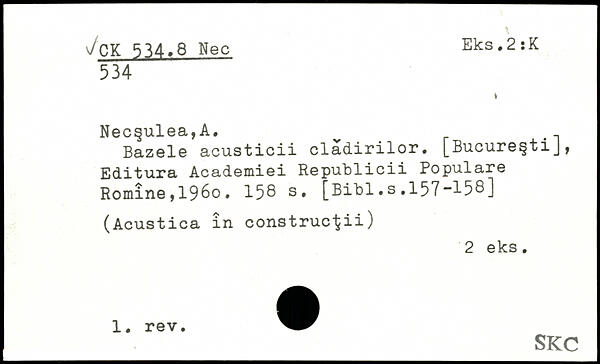 Bazele acusticii cladirilor. [Bucure§tiJ, Editura Academiei Republicii Populäre Romîne,196o.