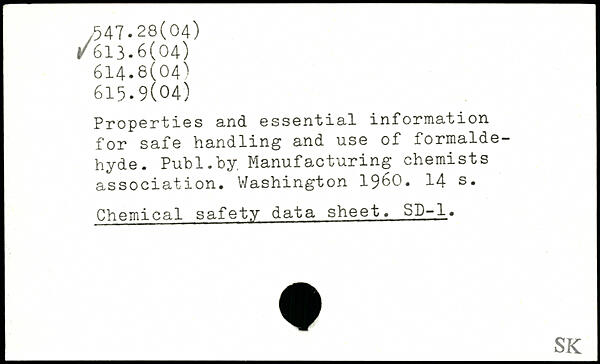 Properties and essential information for safe handling and use of formaldehyde. Pub 1.by. Manufacturing chemists association.