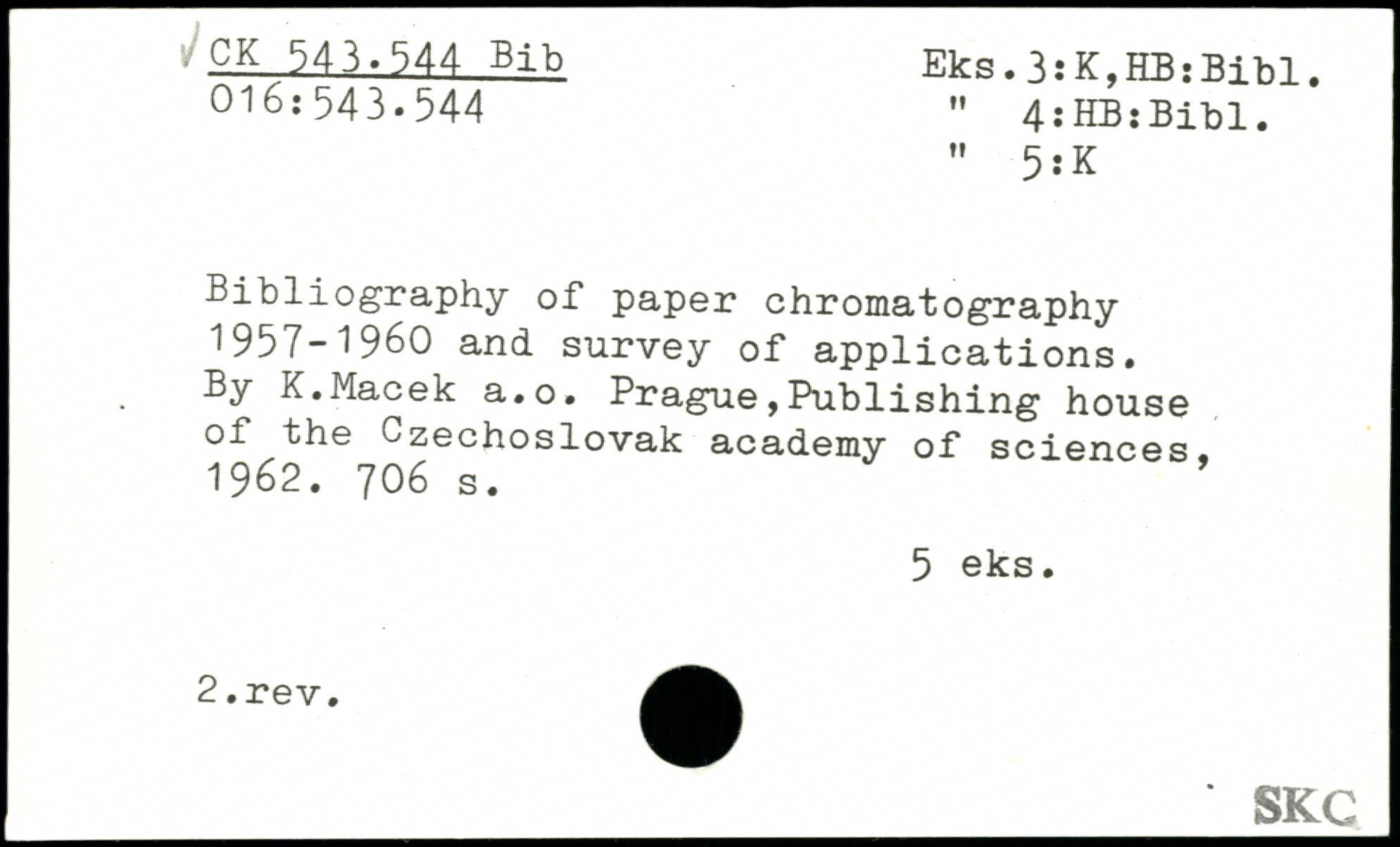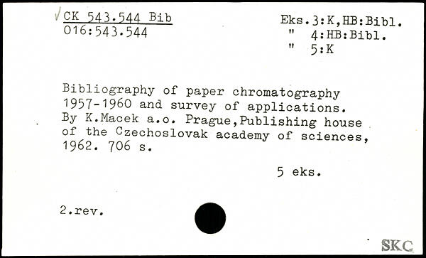 bibliography of paper chromatography 1957-1960 and survey of applications. By K.Macek a.o. Prague,Publishing house of the Czechoslovak academy of sciences, 1962.