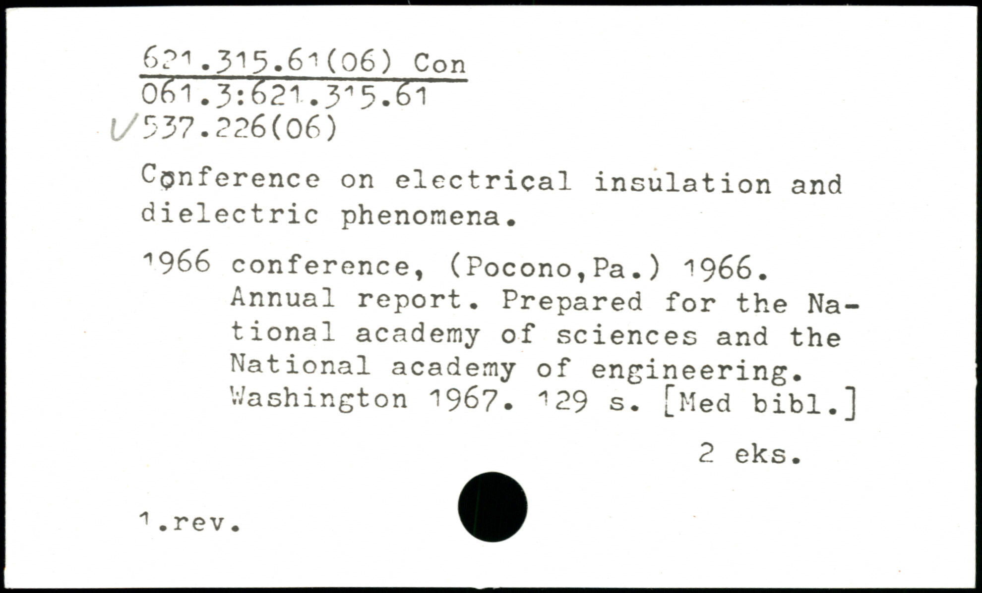 Conference on electrical insulation and dielectric phenomena. ^966 conference, (Pocono,Pa.) 1966. Annual report. Prepared for the National academy of sciences and the National academy of engineering.