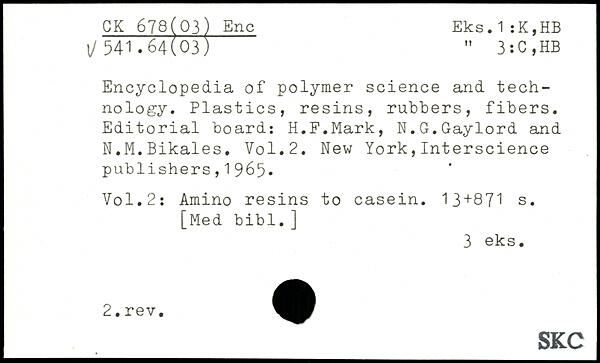 Encyclopedia of polymer science and technology. Plastics, resins, rubbers, fibers. Editorial board: H.F.Mark, N.G.Gaylord and N.M.Bikales.