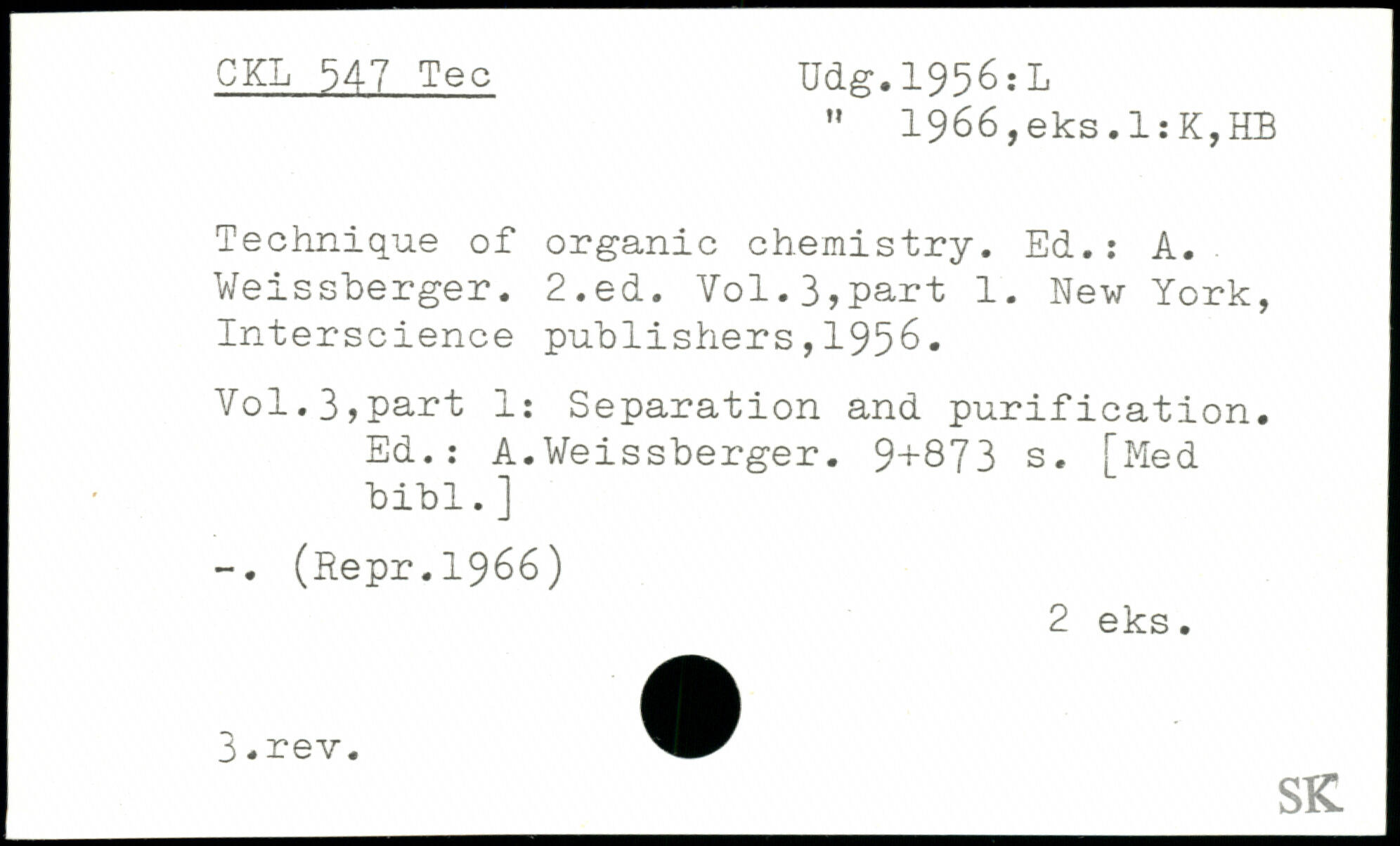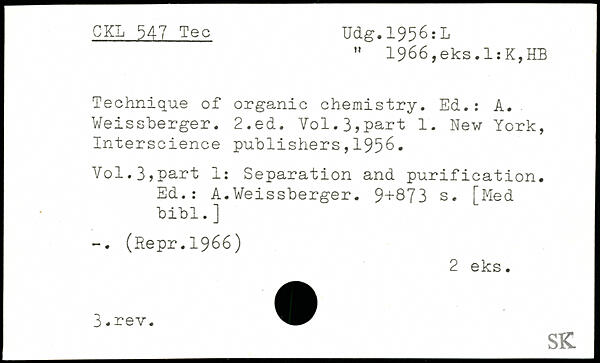 " 1966,eks.l:K,HB Technique of organic chemistry. Ed.: A. Weissberger.