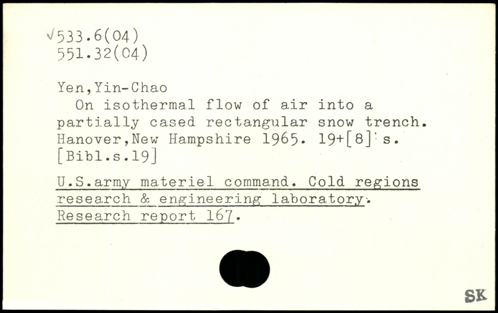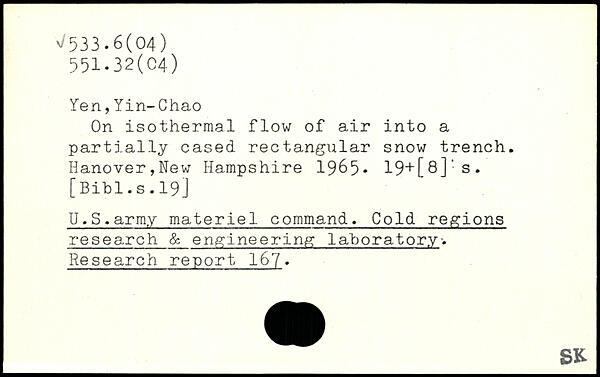 On isothermal flow of air into a partially cased rectangular snow trench. Hanover,New Hampshire 1965. 19+[8] s.