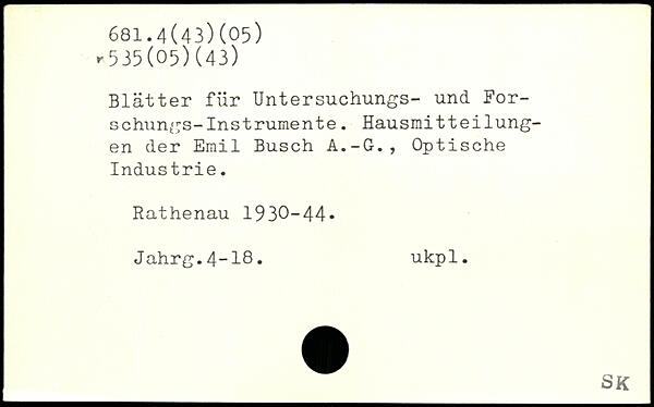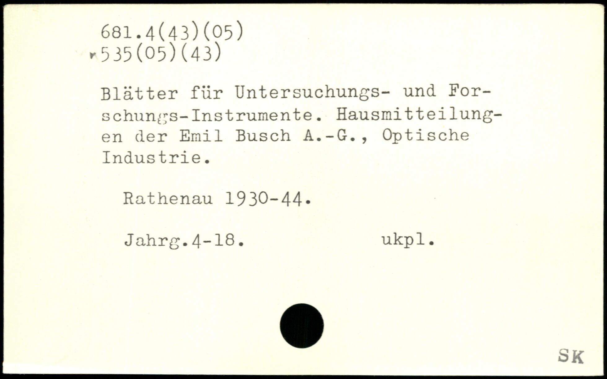 Blätter für Untersuchungs- und For-schungs- Instrumente. HausmitteHungen der Emil Busch A.-G., Optische Industrie. Rathenau 1930-44. Jahrg.4-18. ukpl.