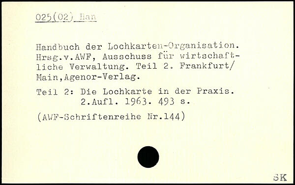 Handbuch der Lochkarten-Organisation. Hrsg.v.AWF, Ausschuss für wirtschaftliche Verwaltung. Teil 2. Frankfurt/ Main,Agenor-Verlag. Teil 2: Hie Lochkarte in der Praxis.