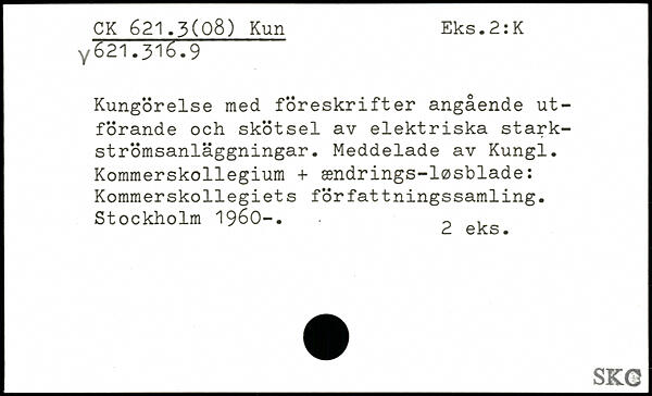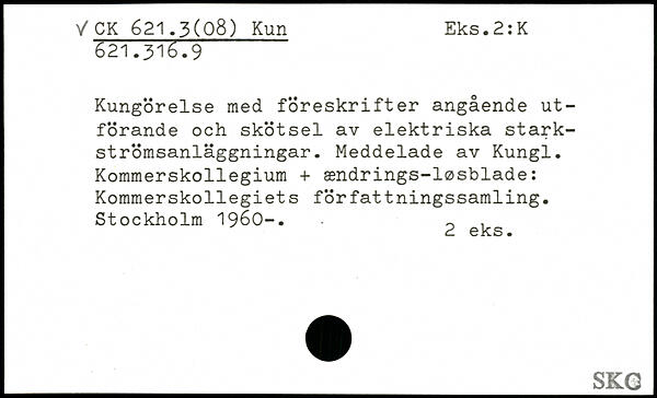 Kungörelse med föreskrifter angående utförande och skötsel av elektriska stark-strömsanläggningar. Meddelade av Kungl. Kommerskollegium + ændrings-løsblade: Kommerskollegiets författningssamling.
