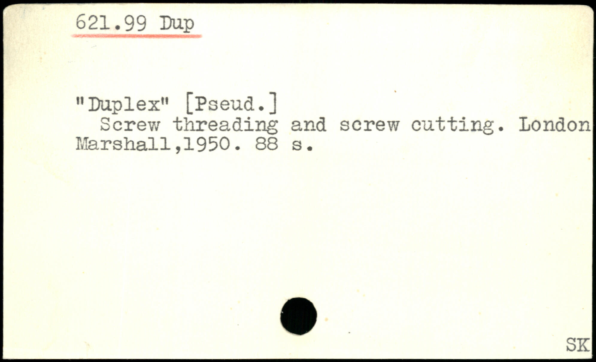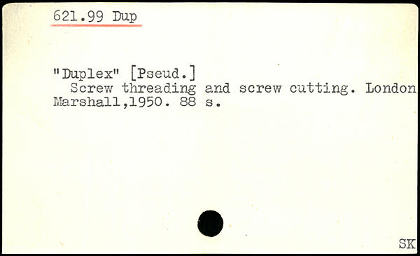 nDuplex” [Pseud.] Screw threading and screw cutting. London Marshal1,1950.