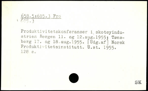 Produktiv!tetskonferanser i skotøyindu-strien Bergen 11. og 12.aug.1955j Tøns-berg 17. og 18. aug.1955, [Ndg.af] Norsk Produkti^itetsinstitutt. U.st. 1955o