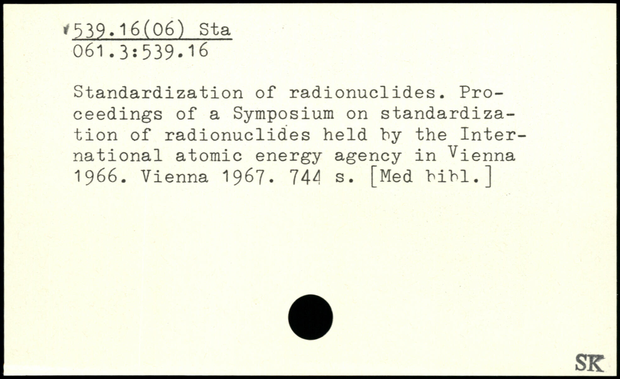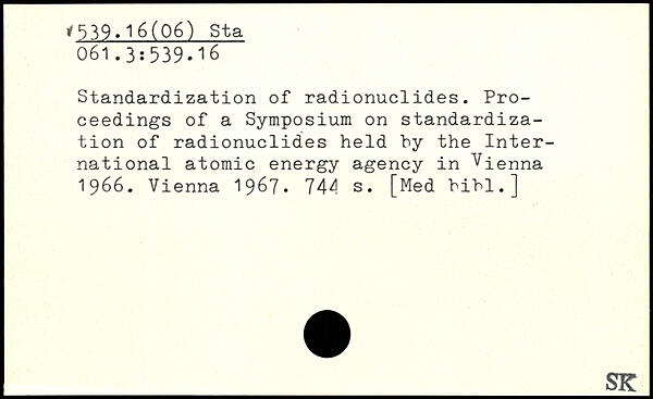 Standardization of radionuclides. Proceedings of a Symposium on standardization of radionuclides held by the International atomic energy agency in Vienna. 1966. Vienna 1967-