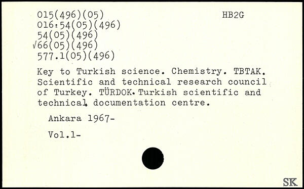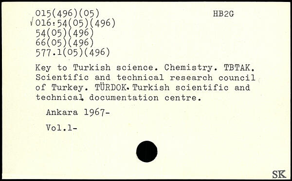Key to Turkish science. Chemistry. TBTAK. Scientific and technical research council of Turkey. TÜRD0K. Turkish scientific and technical documentation centre. Ankara 1967- Vol.l-