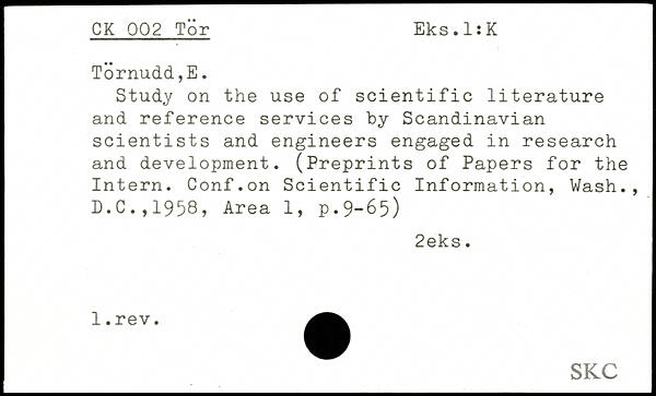 Study on the use of scientific literature and reference services by Scandinavian scientists and engineers engaged in research and development. (Preprints of Papers for the Intern. Conf.on