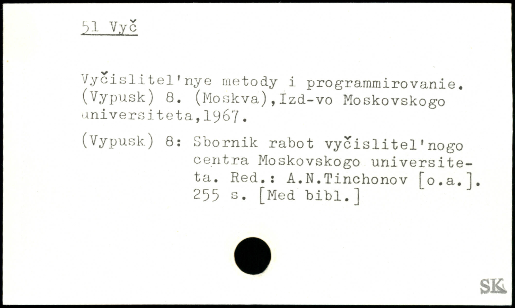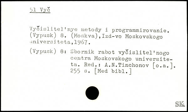 Vycislitel'nye metody i programmirovanie. (Vypusk) 0. (Moskva),Izd-vo Moskovskogo aniversiteta,1967. (Vypusk) 8: Sbornik rabot vycislitel'nogo centra Moskovskogo universiteta. Red.: A.N.Tinchonov [o.a.].