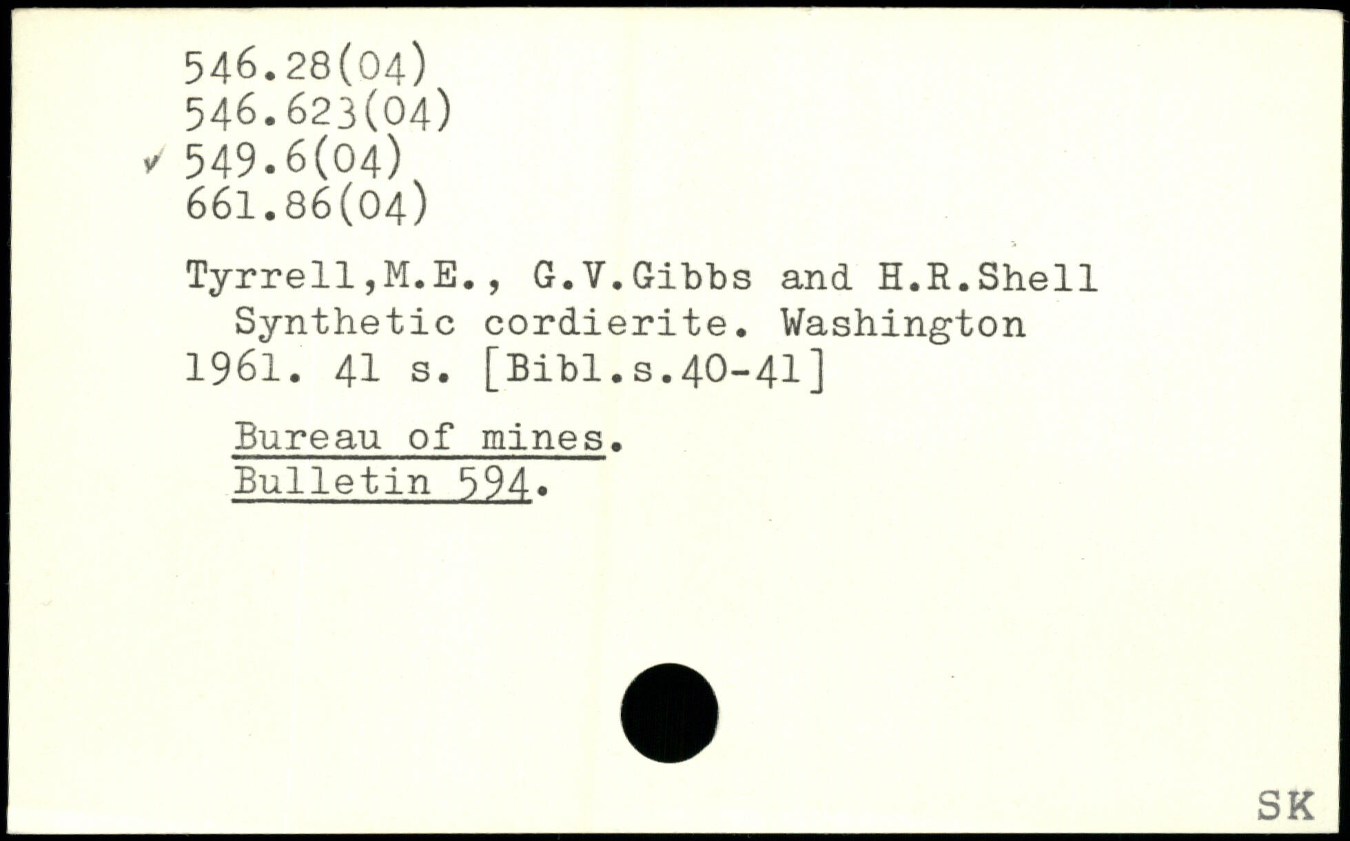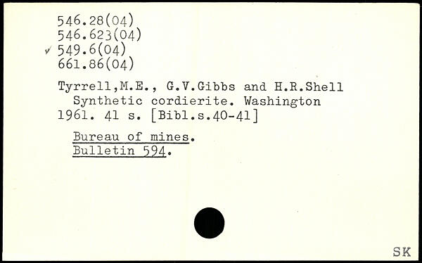 Tyrrell,M.E., G.V.Gibbs and H.R.Shell Synthetic cordierite.