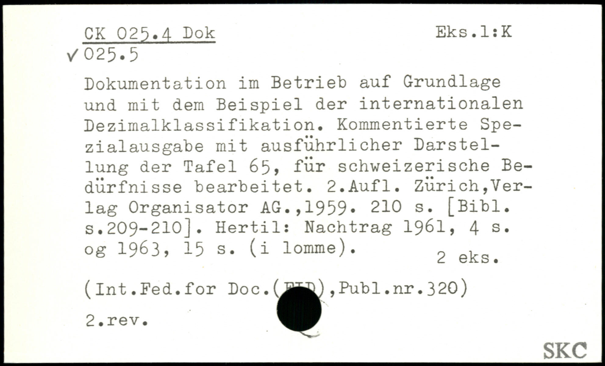 Dokumentation im Betrieb auf Grundlage und mit dem Beispiel der internationalen Dezimalklassifikation. Kommentierte Spezialausgabe mit ausführlicher Darstellung der Tafel 65, für schweizerische Bedürfnisse bearbeitet.