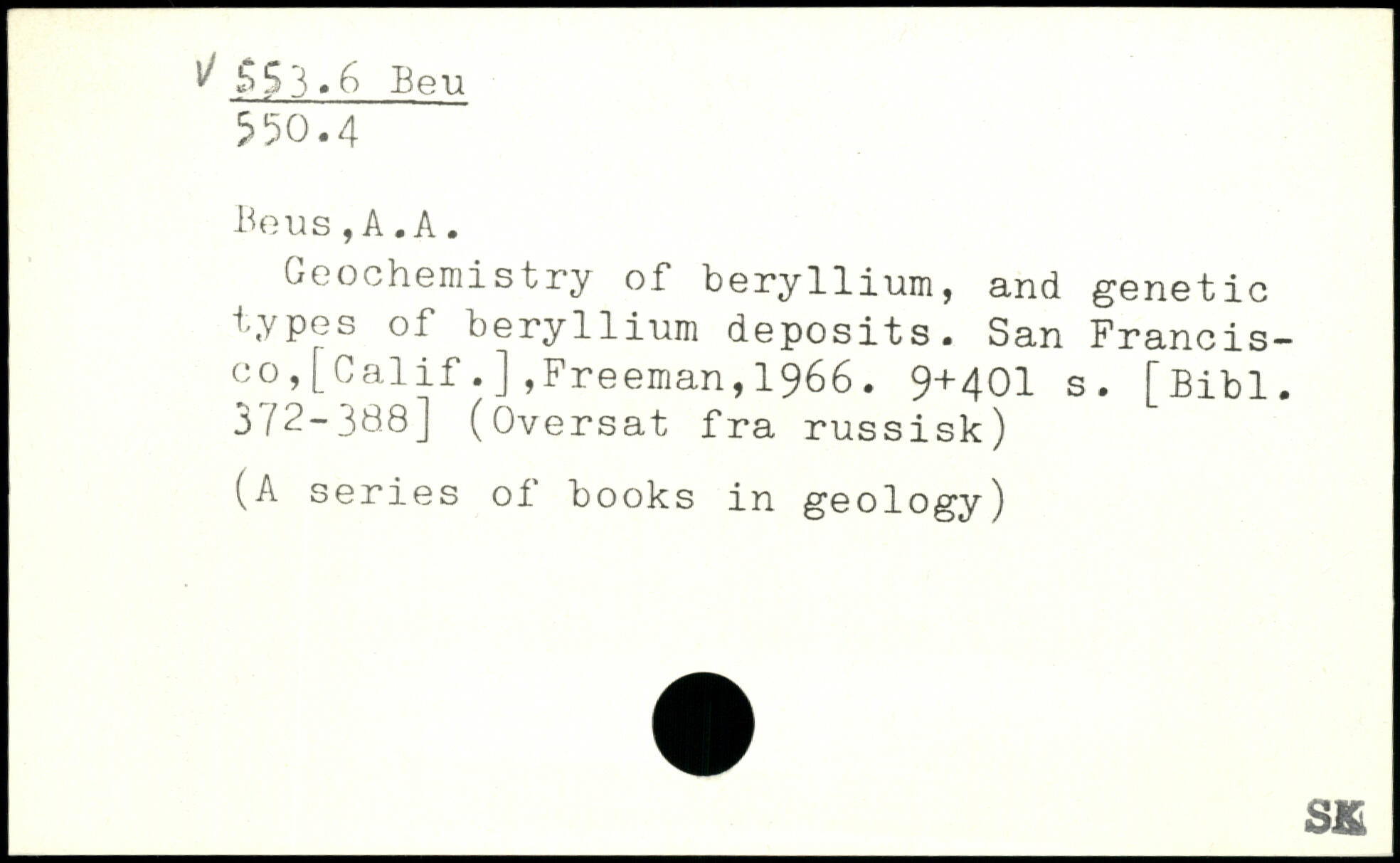 Geochemistry of beryllium, and genetic types of beryllium deposits. San Francisco ,[Calif.],Freeman,1966. 9+40I s.