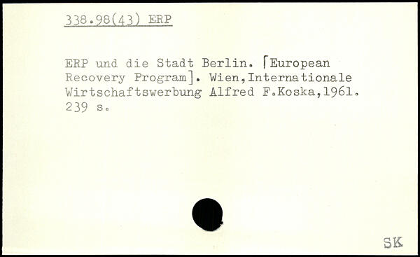 ERP und die Stadt Berlin. [European Recovery Program]. Wien,Internationale Wirtschaftswerhung Alfred F.Koska,1961.