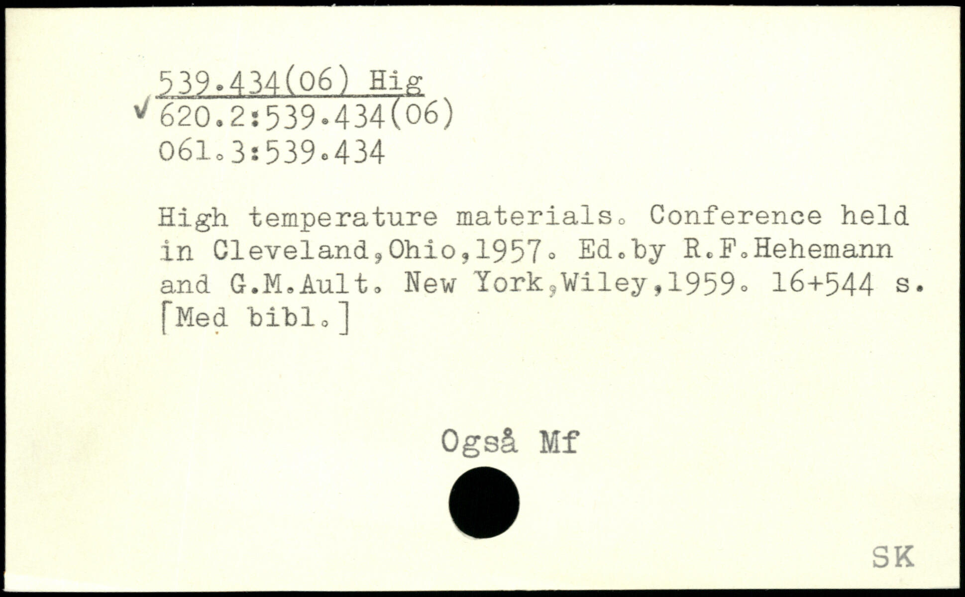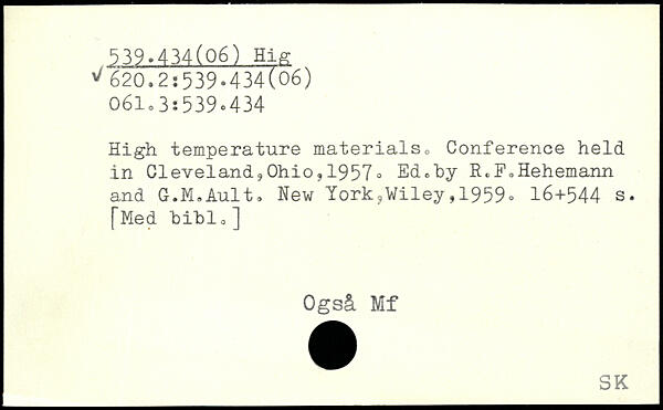High temperature materials, Conference held in Cleveland,Ohio,1957. Ed,by R,.F,Hehemann and G.M.Ault. New York?Wiley,1959, I6+544 s. [Med biblo] Også Mf