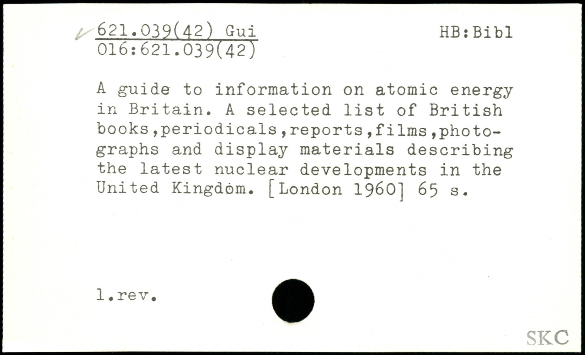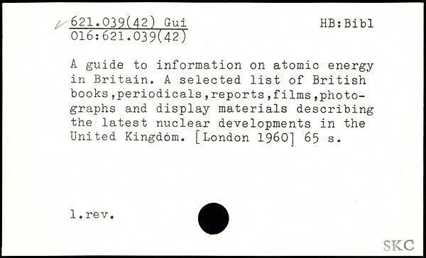 A guide to information on atomic energy in Britain. A selected list of British books,periodicals ,reports ,films ,photographs and display materials describing the latest nuclear developments in the United Kingdom.