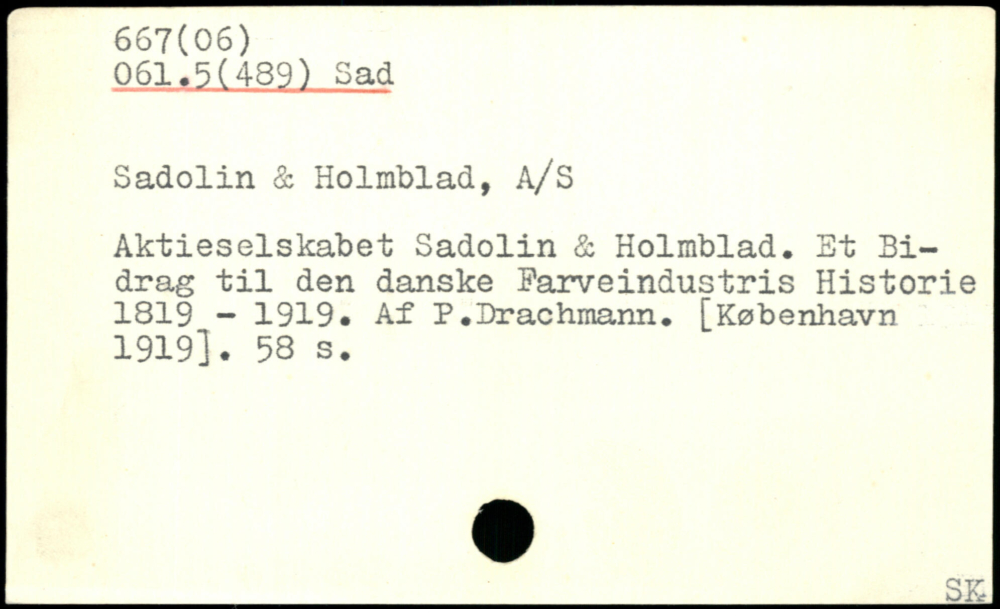 061.5(489) Sad Sadolin & Holmblad, A/S Aktieselskabet Sadolin & Holmblad. Et Bidrag til den danske Farveindustris Historie 1819 - 1919. Af P.Drachmann.