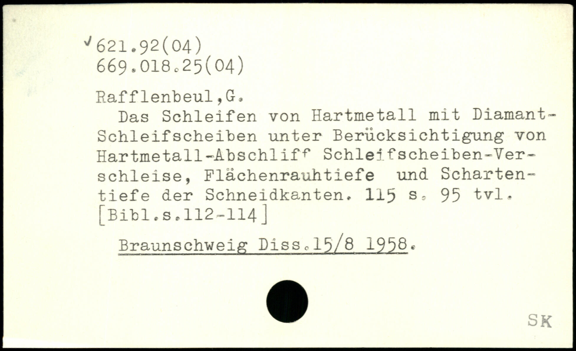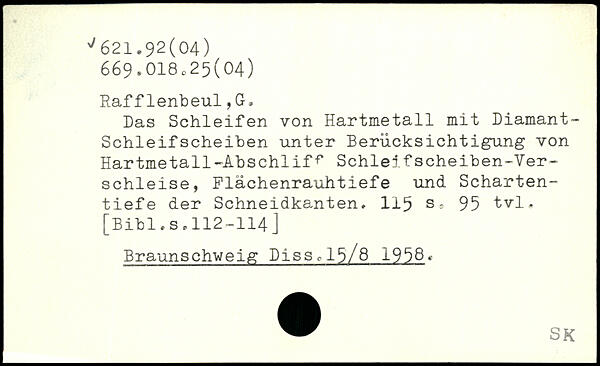 Das Schleifen von Hartmetall mit Diamant-Schleifscheiben unter Berücksichtigung von Hartmetall -Abs chlif .. Schleif scheiben -Ver-schleise, Flächenrauhtiefe und Schartentiefe der Schneidkanten, 1±