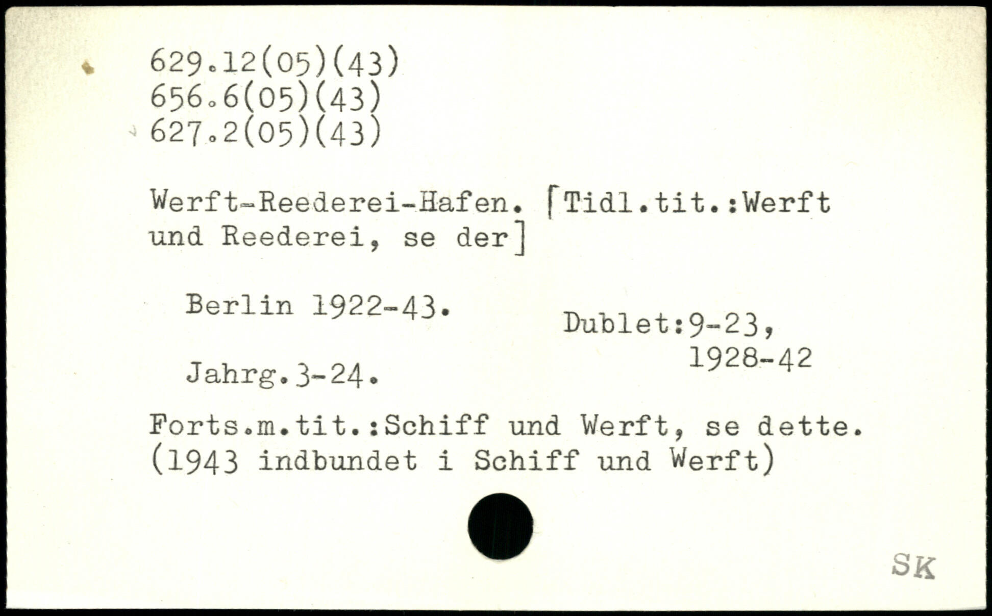 Werft-Reederei-Hafen. fTidl.tit.:Werft und Reederei, se der] Berlin ±922-43. Dublet:9-23, Jahrg.3-24. 1928-42 Forts.m.tit.iSchiff und Werft, se dette. (1943 indbundet i Schiff und Werft)