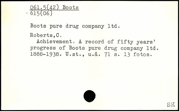 Boots pure drug company ltd. Roberts,Co Achievement- A record of fifty years1 progress of Boots pure drug company ltd, 1888-1938. U.st,, u.a.
