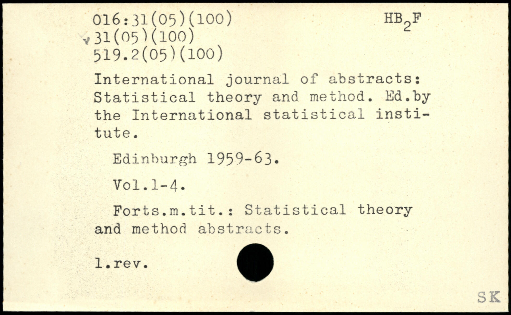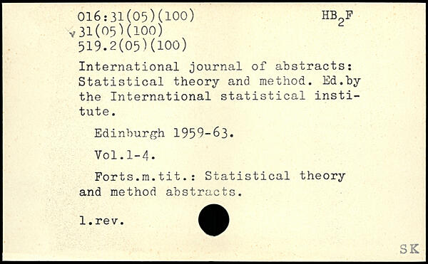 International journal of abstracts: Statistical theory and method. Ed.by the International statistical institute. Edinburgh 1959-63. ¥ol.l-4. Forts.m.tit.: Statistical theory and method abstracts.