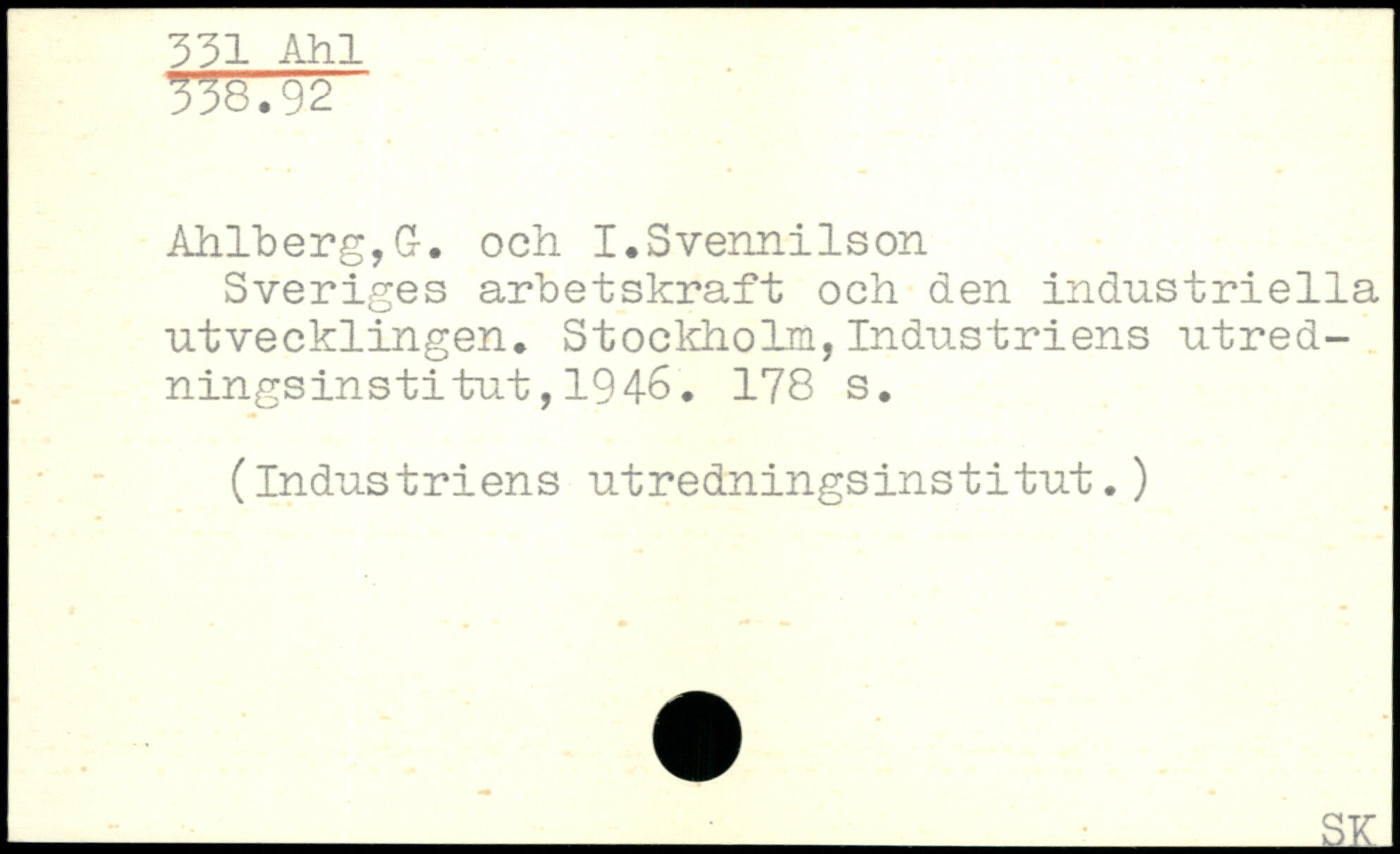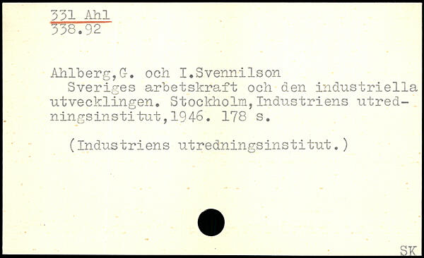 Sveriges arbetskraft och den industriella utvecklingen. Stockholm,Industriens utredningsinstitut , 194-6.