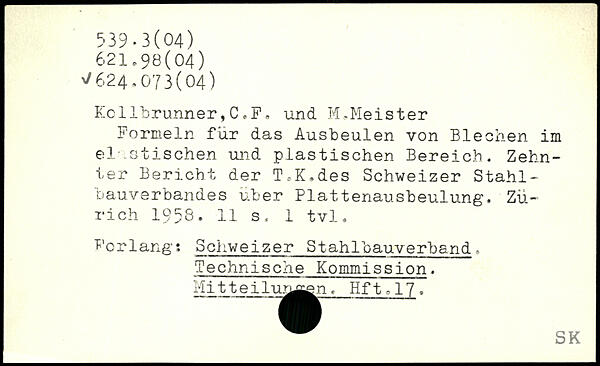 Kollbrunner,C.F, und M-Meister Formeln für das Ausbeulen von Blechen im eistischen und plastischen Bereich. Zehnter Bericht der T.K.des Schweizer Stahl-bauveroandes über Plattenausbeulung. Zürich 1958.