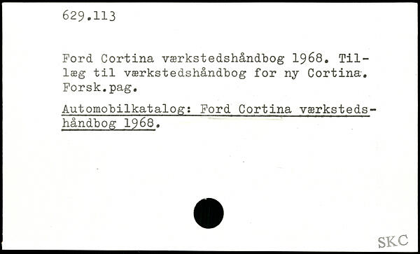 Ford Cortina værkstedshåndbog 1968. Tillæg til værkstedshåndbog for ny Cortina. Forsk.pag. Automobilkatalog: Ford Cortina værksteds-håndbog 1968.