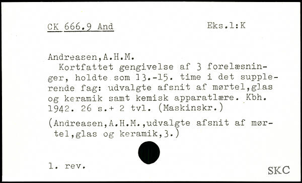 Kortfattet gengivelse af 3 forelæsninger, holdte som 13.-15, time i det supplerende fag: udvalgte afsnit af mørtel,glas og keramik samt kemisk apparatlære. Kbh. 1942.