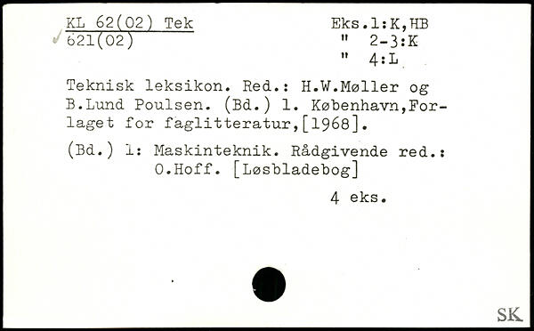 Teknisk leksikon. Hed.: H.W.Møller og B.Lund Poulsen. (Bd.) 1.