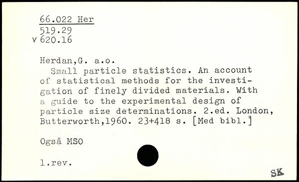 Herdan,G. a.o. Small particle statistics. An account of statistical methods for the investigation of finely divided materials. With a guide to the experimental design of particle size determinations.
