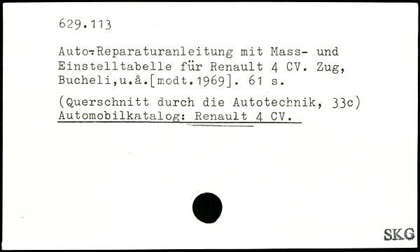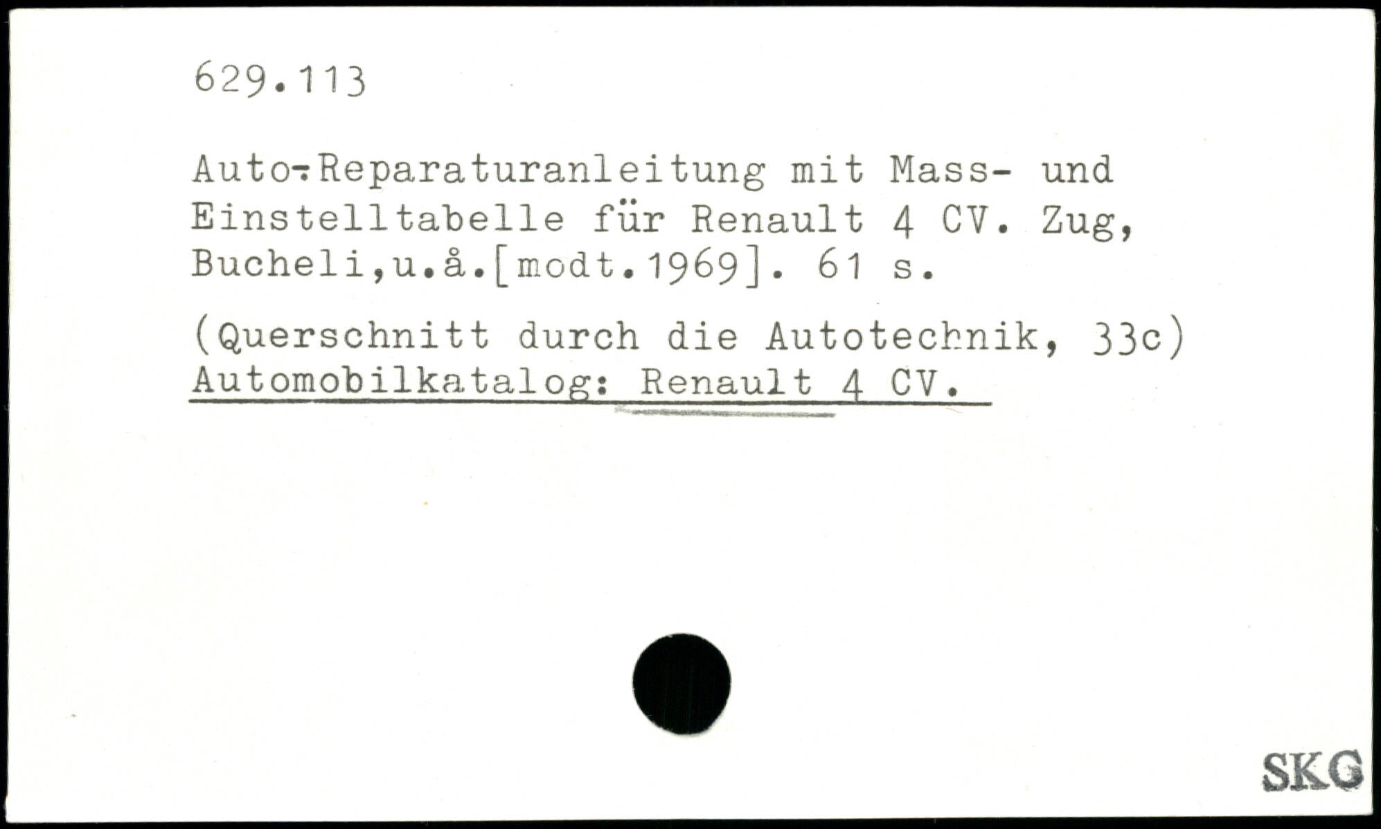 Auto-Reparaturanleitung mit Mass- und Einstelltahelle für Renault 4 CV. Zug, Bucheli,u.a.[modt.1969].