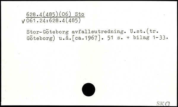Stor-Göteborg avfallsutredning. U.st.(tr. Göteborg) u.å.[ca.1967]. 5^ s. + bilag 1-33. _ :o