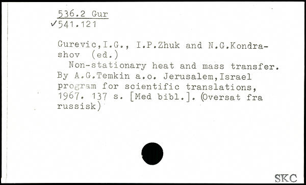Gurevic,I.G., I.P.Zhuk and N.G.Kondra-j shov (ed.) Non-stationary heat and mass transfer. By A.G.Temkin a.o. Jerusalem,Israel program for scientific translations, 1967