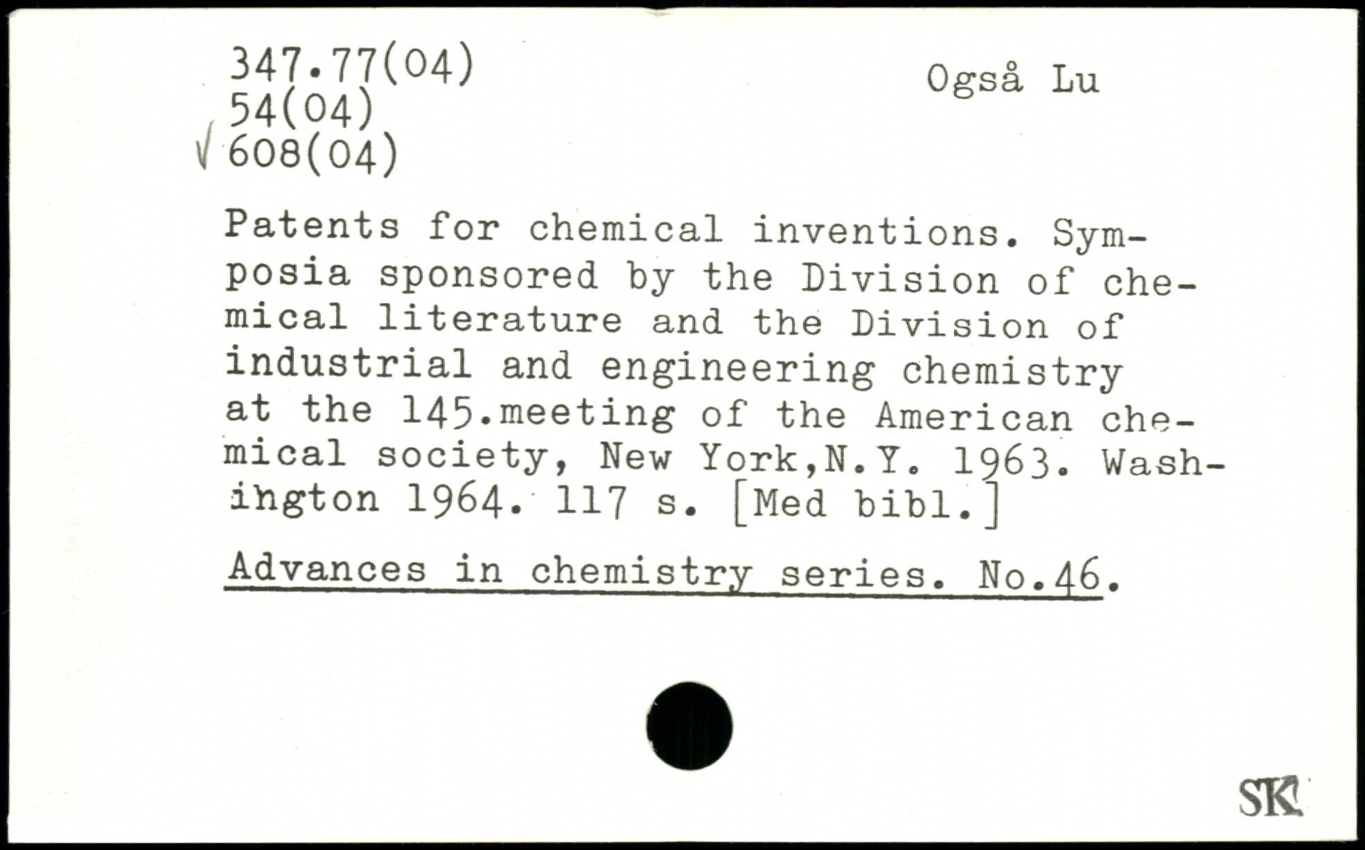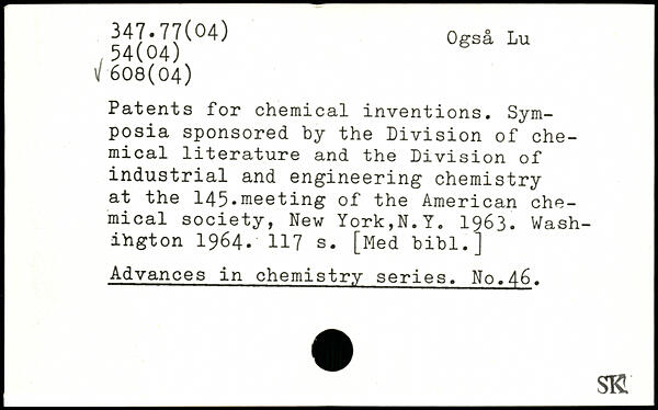 Patents for chemical inventions. Symposia sponsored by the Division of chemical literature and the Division of industrial and engineering chemistry at the 145,nieeting of the American chemical society, New York,N.Y. 1963.