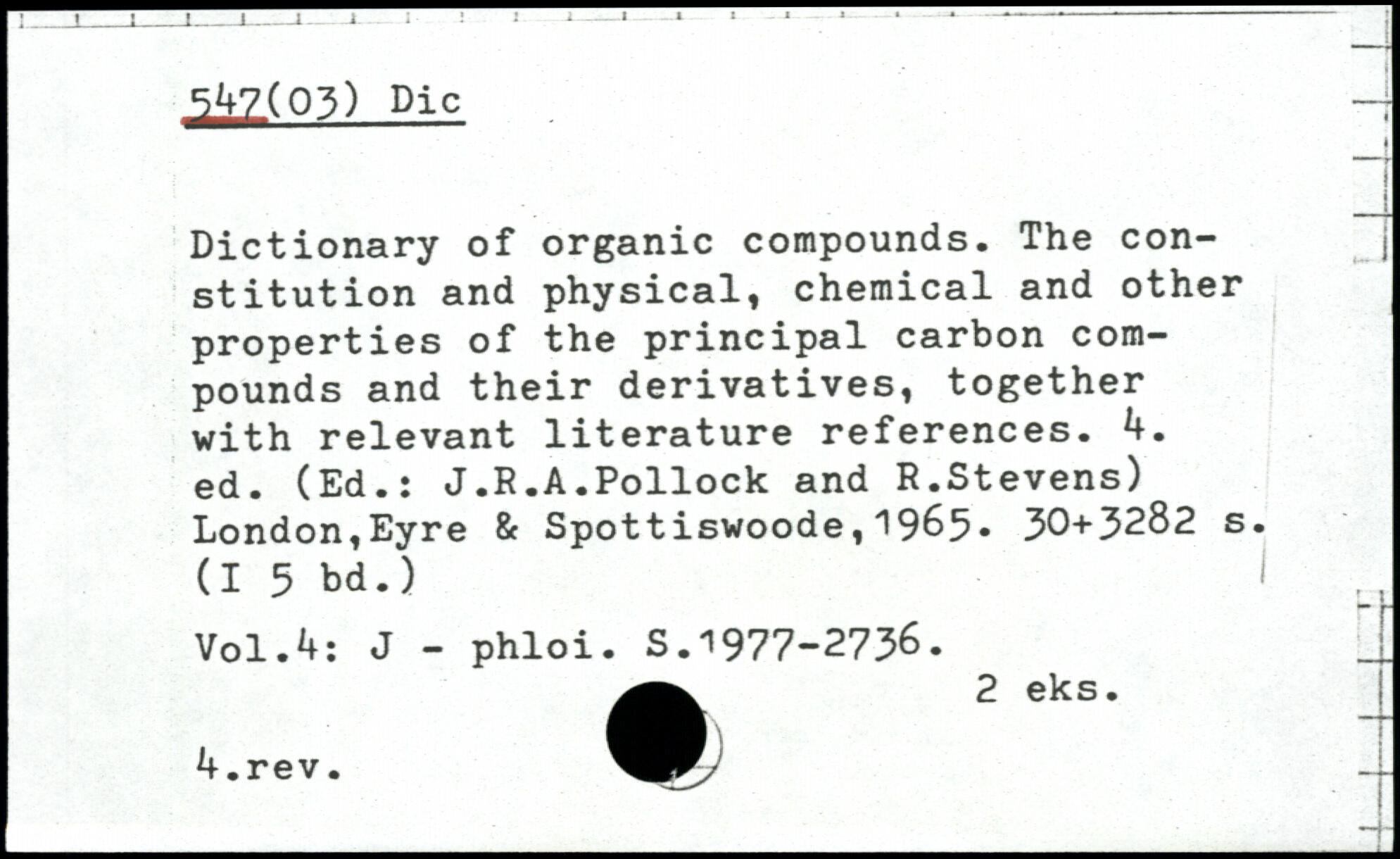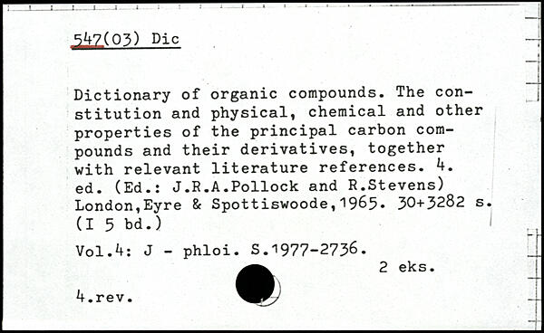 Dictionary of organic compounds. The constitution and physical, chemical and other properties of the principal carbon compounds and their derivatives, together with relevant literature references, k, ed. (Ed.: J.R.A.Pollock and R.Stevens)