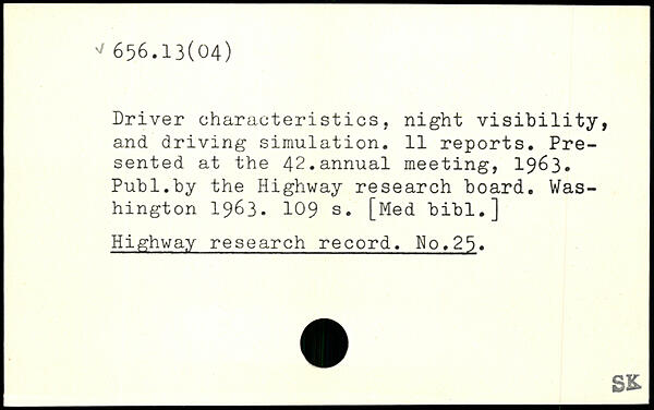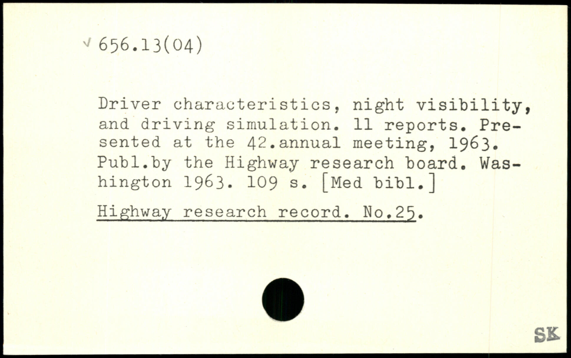 Driver characteristics, night visibility, and driving simulation. 11 reports. Presented at the 42.annual meeting, 1963.