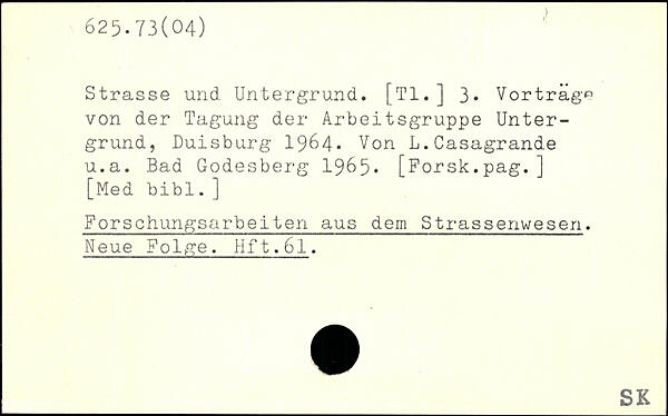 Strasse und Untergrund. [TI.] 3. Vortrage von der Tagung der Arbeitsgruppe Untergrund, Duisburg 1964. Von L.Casagrande u.a. Bad Godesberg 1965. [Forsk.pag.]