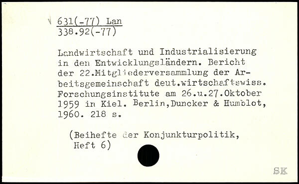 Landwirtschaft und Industrialisierung in den Entwicklungsländern. Bericht der 22.HitgliederverSammlung der Ar-heit sgemeinschaft aeut.wirtschaftsvjiss. Forschungsinstitute am 26.u.27.Oktober 1959 in Kiel.