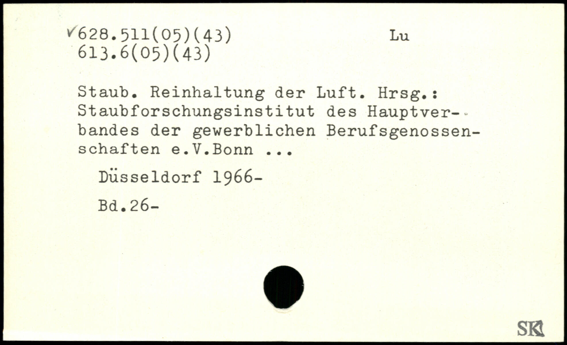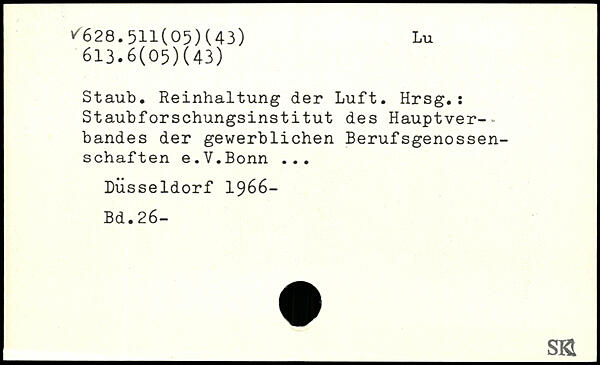 Staub. Reinhaltung der Luft. Hrsg.i Staubforschungsinstitut des Hauptver--bandes der gewerblichen Berufsgenossen-schaften e.V.Bonn ... Düsseldorf 1966-