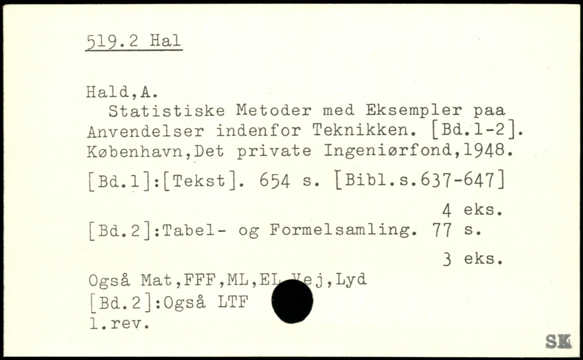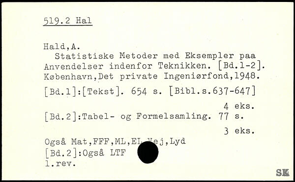 Statistiske Metoder med Eksempler paa Anvendelser indenfor Teknikken.