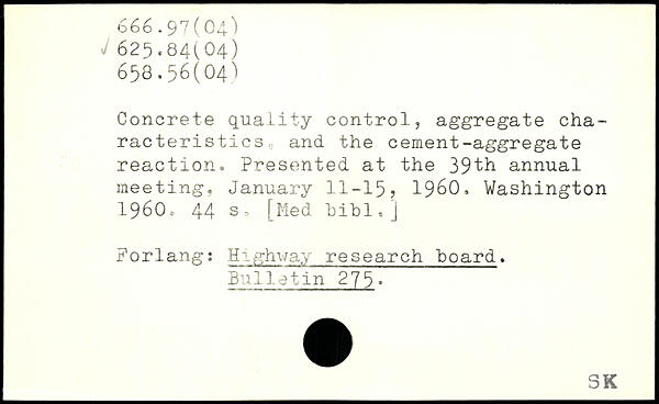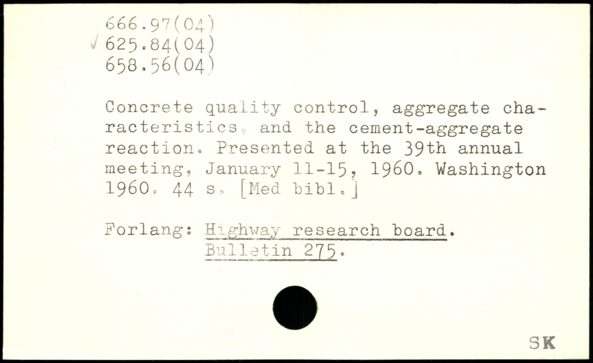 Concrete quality control, aggregate characteristics and the cement-aggregate reaction. Presented at the 39th annual meeting, January 11-15, 1960.