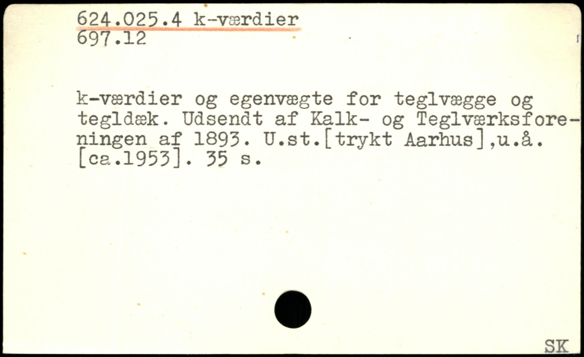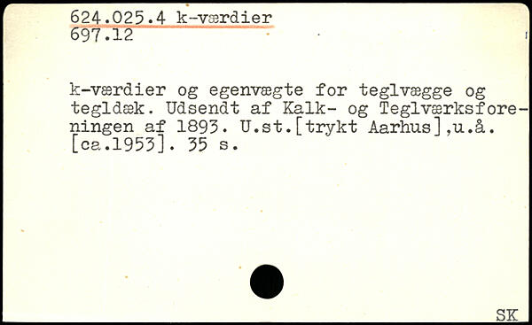 k-værdier og egenvægte for teglvægge og tegldæk. Udsendt af Kalk- og Teglværksforeningen af 1893. U.st.[trykt Aarhus],u.å. [oa.1953].